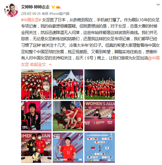 跟队10年的女足专项记者艾婷婷在微博上写道:“对于女足,总是大赛的时候全民关注,然后迅速降温无人问津……我们都早已习惯了这种‘被关注十几天、冷落大半年’的日子。”