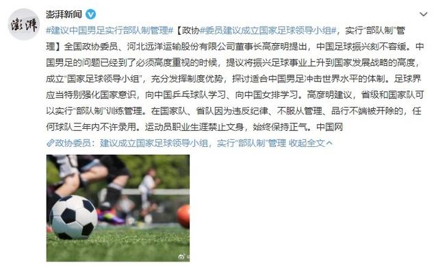 高委员的建议包括,国家队和省队实行“部队制”管理,违纪不服管理被开除的,三年内不许踢球;整个球员生涯禁止纹身;学习女排精神、乒乓精神等等……