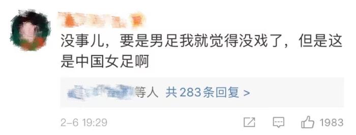 翻看决赛那一天微博上实时的战报,中国队一球落后时,评论却是:没事儿,要是男足我就觉得没戏了,但是这是中国女足啊。