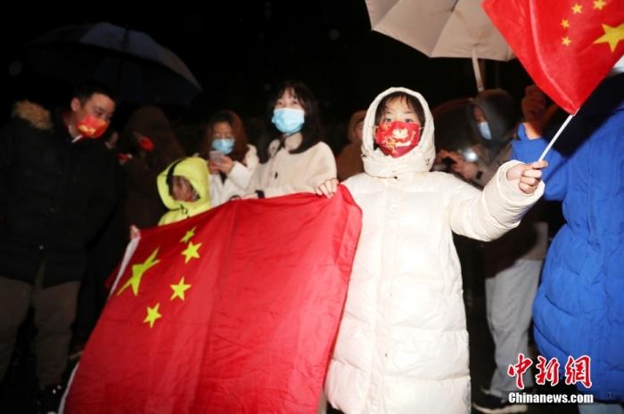 2月7日晚,夺得亚洲杯冠军的中国国家女子足球队一行抵达上海。在隔离酒店外,冒雨前来的不少球迷高举国旗,欢迎中国女足凯旋而归。中新社记者 张亨伟 摄